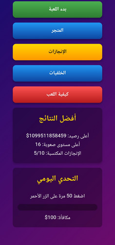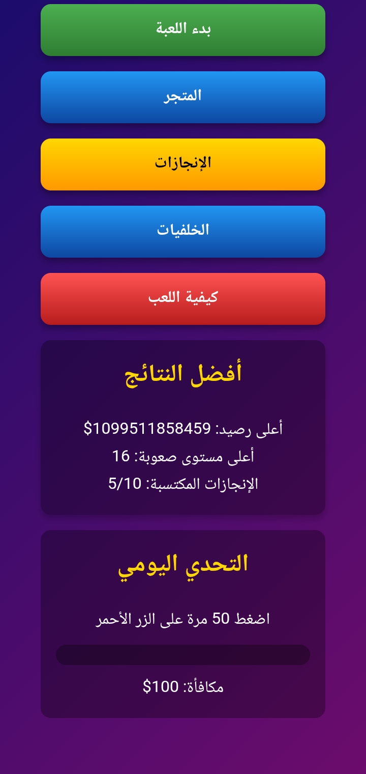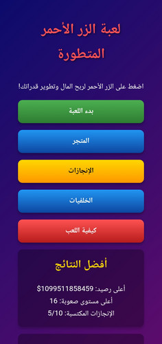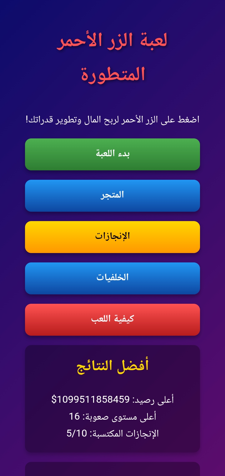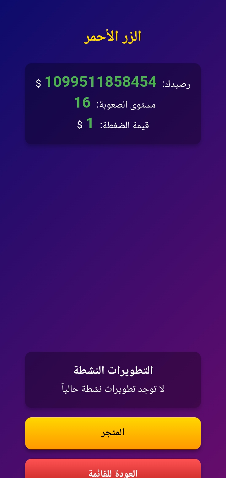 "لعبة الزر الأحمر" هي لعبة تفاعلية مسلية تعتمد على الضغط المتكرر على زر أحمر لزيادة الرصيد المالي، مع نظام صعوبة تدريجي وتطويرات مؤقتة تجعلها ممتعة وتحدية.
